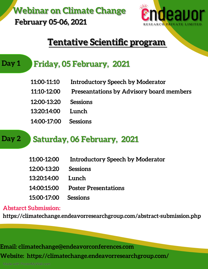 Endeavor Research private Limited is glad to announce the “Webinar on Climate Change“ which is going to be held on April 07-08, 2021. Climate Change webinar hosts presentations from experts across the world in the field of Climatology that create awareness and understanding of the work done by the scientists and professors working in the various fields of Climatology.